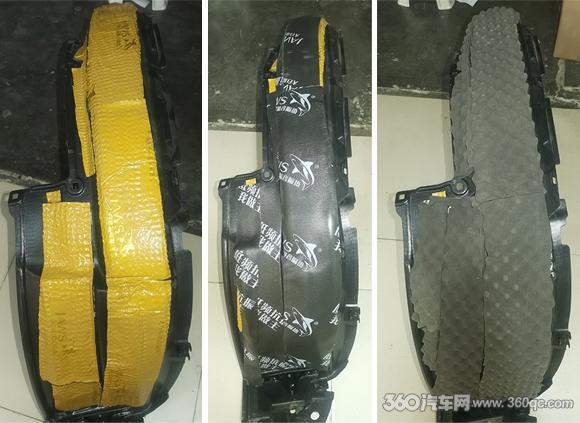 最终是叶子板的隔音处理。叶子板和拆下来的轮胎轮弧分别用金鲨JS500减震胶、隔音垫、高弹吸音棉三种隔音材料,做了三层隔音处理,将行进中轮胎与地上冲突所发生的胎噪降至最低。