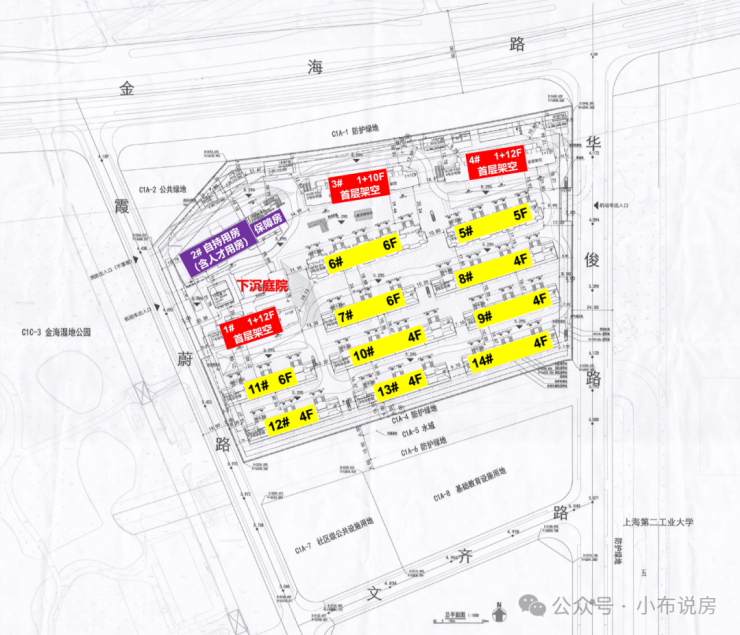 对比来看,新地块优点是距离地铁站更近,直线号线米,而且地块面宽更大,户型设计可优化空间多;挑战则是北侧即为金海高架,需投入隔音降噪成本,且涵盖4000㎡商服用地。